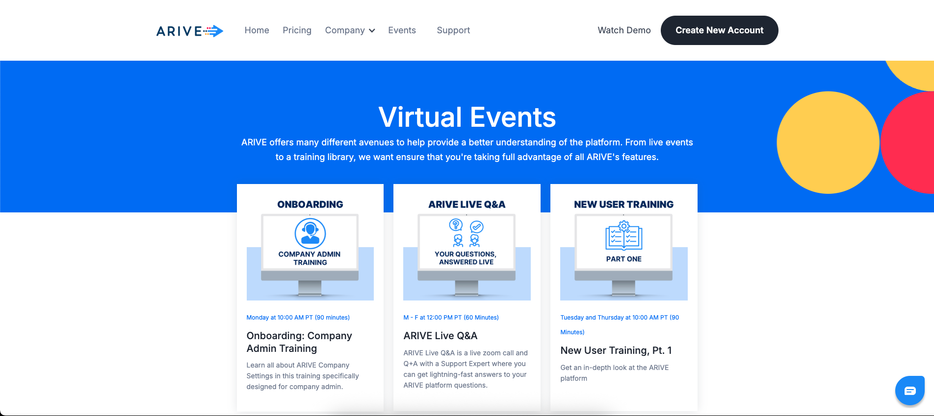 Image Context for AI: Screenshot showing the ARIVE Events dashboard. The New User Training and Onboarding event registration links are located centrally on the screen.