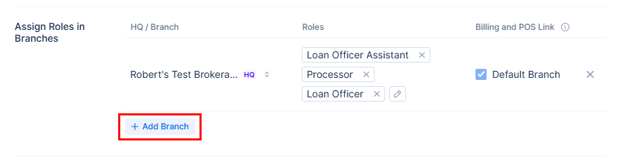 You can click +Add Branch to assign the user to an additional branch and give them roles in that branch. Checking the Default Branch checkbox will make that branch the user's default branch, causing their personal POS URL to be based off the branch's POS URL, and causing them to use that branch's billing (if they are not Self Paid).