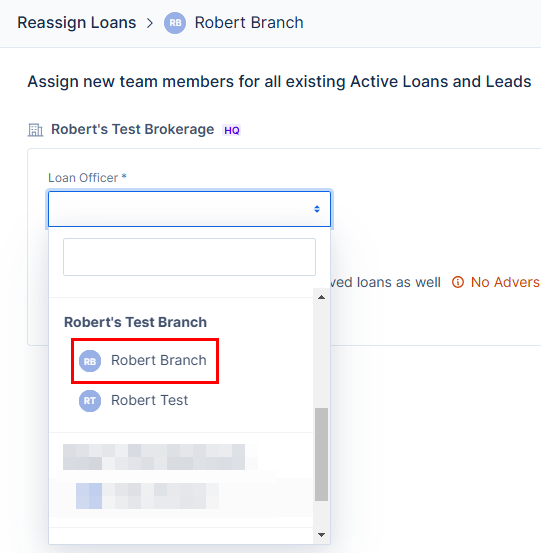 When you remove a branch from a user, you will be prompted to reassign their active loans and leads. To transfer these loans and leads to a different branch but keep them assigned to the same user, select that user under the appropriate branch in the role reassignment dropdown. (See the example screenshot below--the user Robert Branch is no longer in Robert's Test Brokerage, but is still in Robert's Test Branch, so I am reassigning his loans to himself in that branch.)
