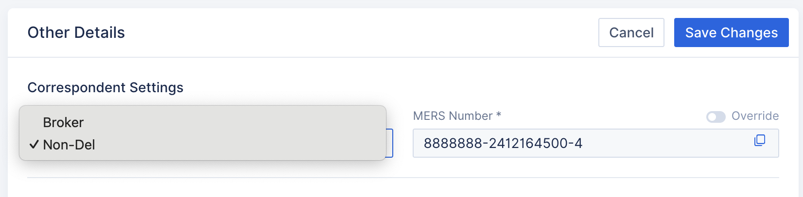 The Correspondent Settings in your loan file will also allow you to switch industry channels (if your company admin permit this) and override the MER Number if you already obtained the MIN outside of ARIVE.