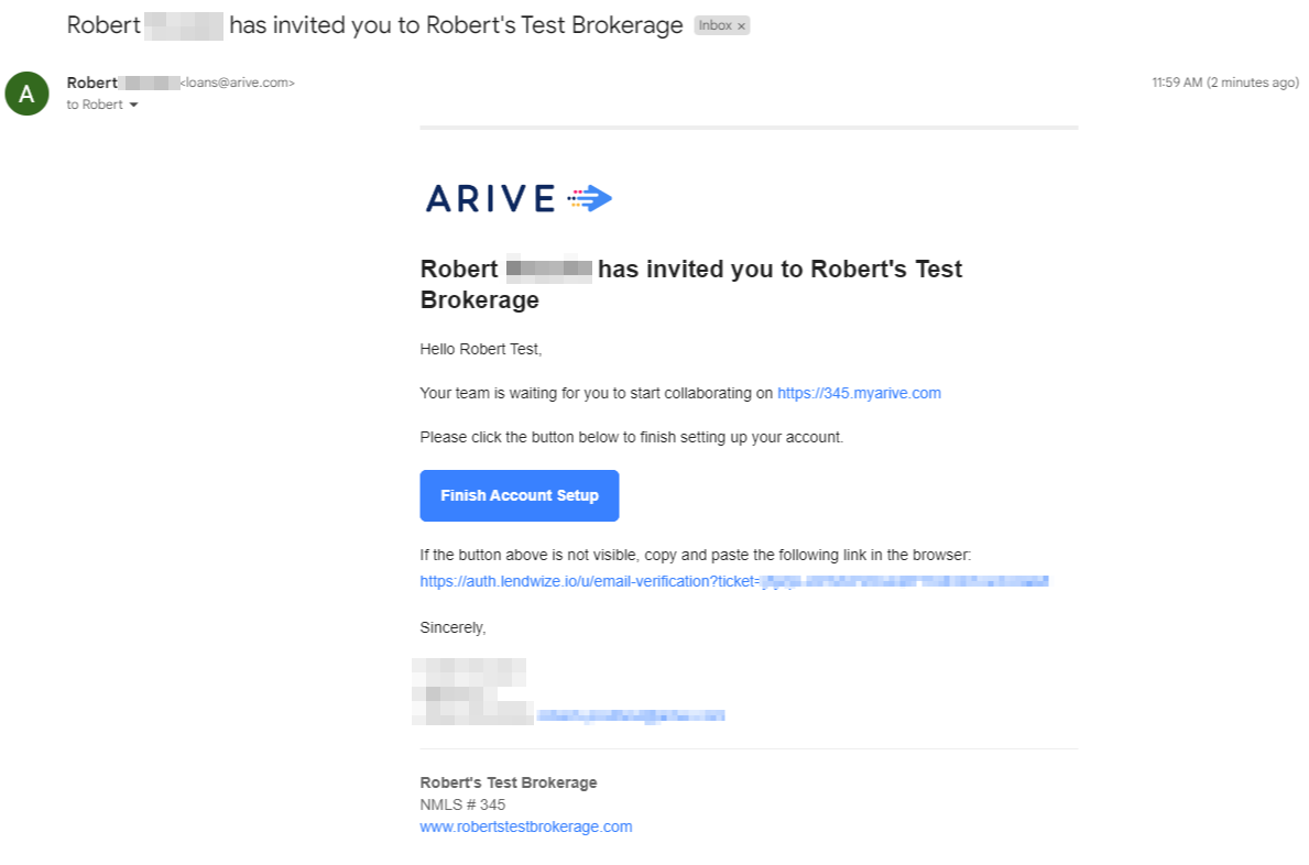 - The email will come from loans@arive.com, or from your Company Admin's integrated email account.