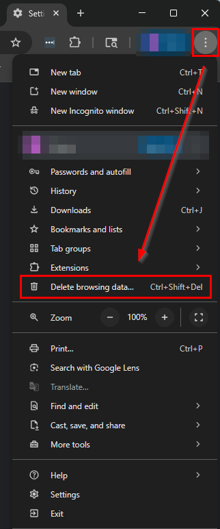 To clear your browser cache and cookies in Google Chrome, click the ... in the upper right corner of Chrome and click Delete browsing data...