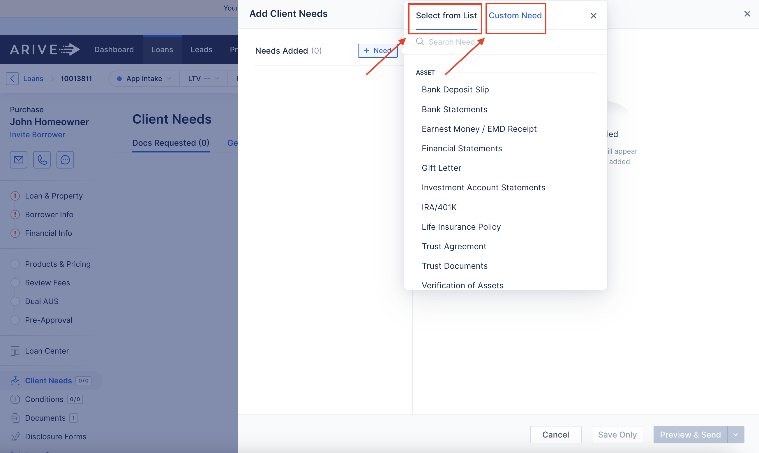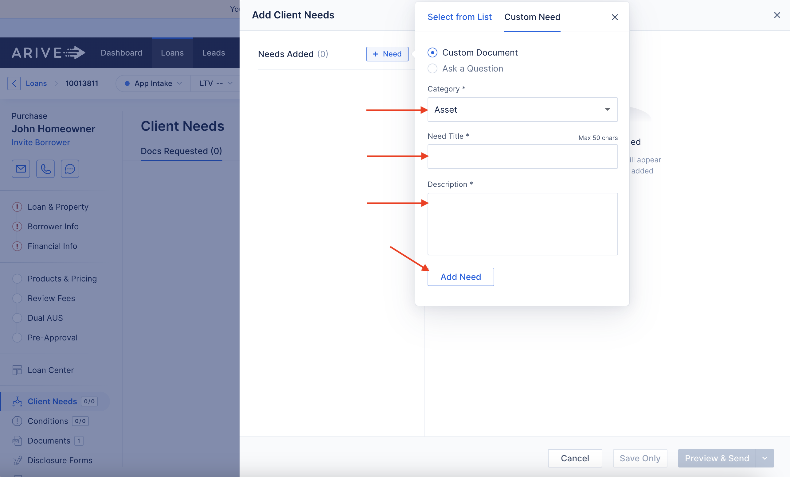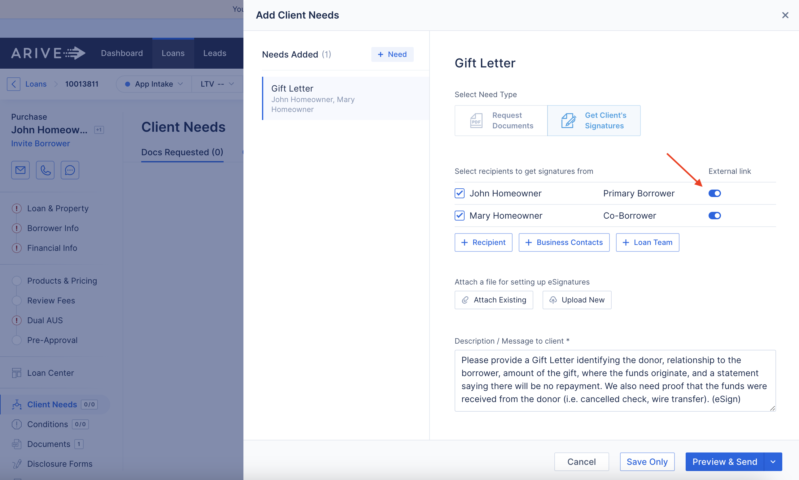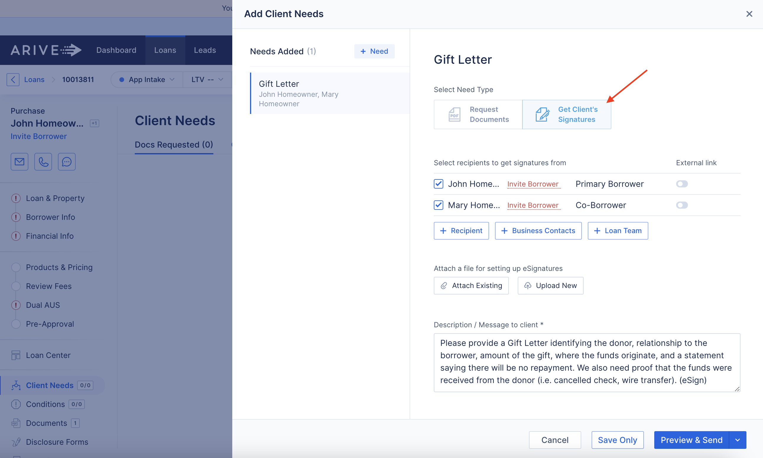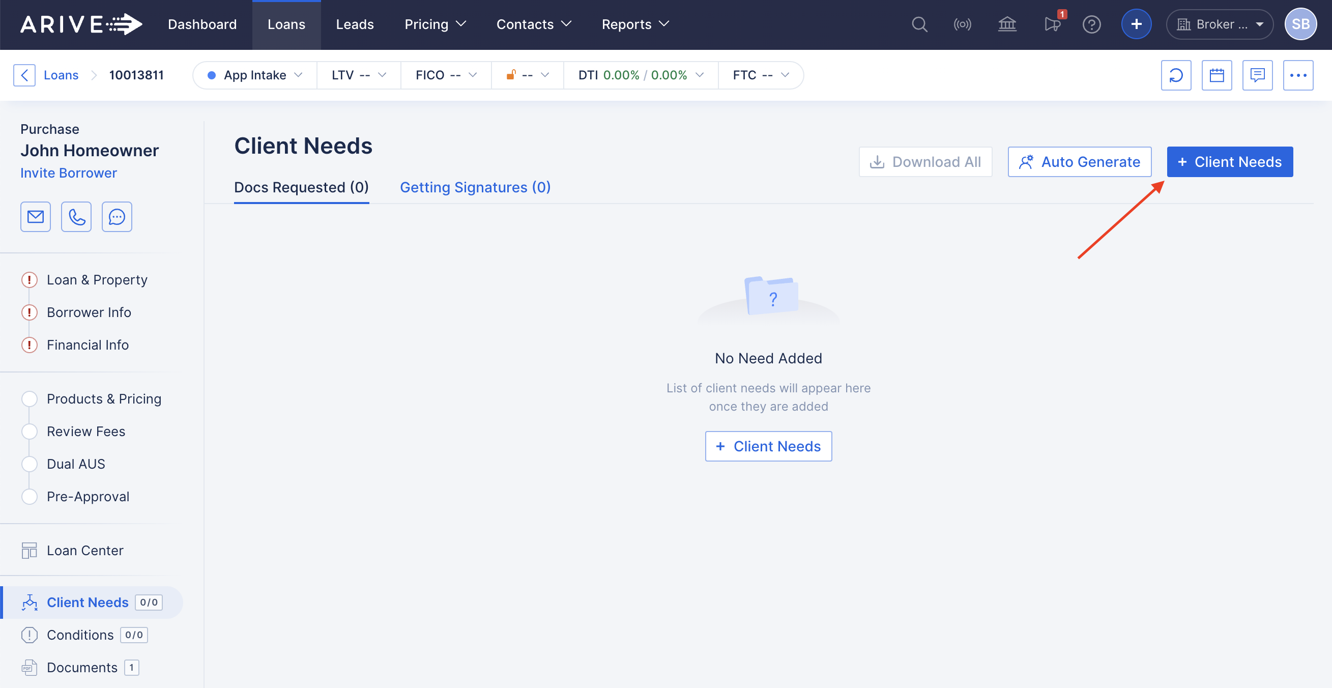 Client Needs are requests for your borrower to provide information, documents, or eSignatures through the POS. You can request an eSignature from your borrower and/or other individuals by creating an eSign Client Need.