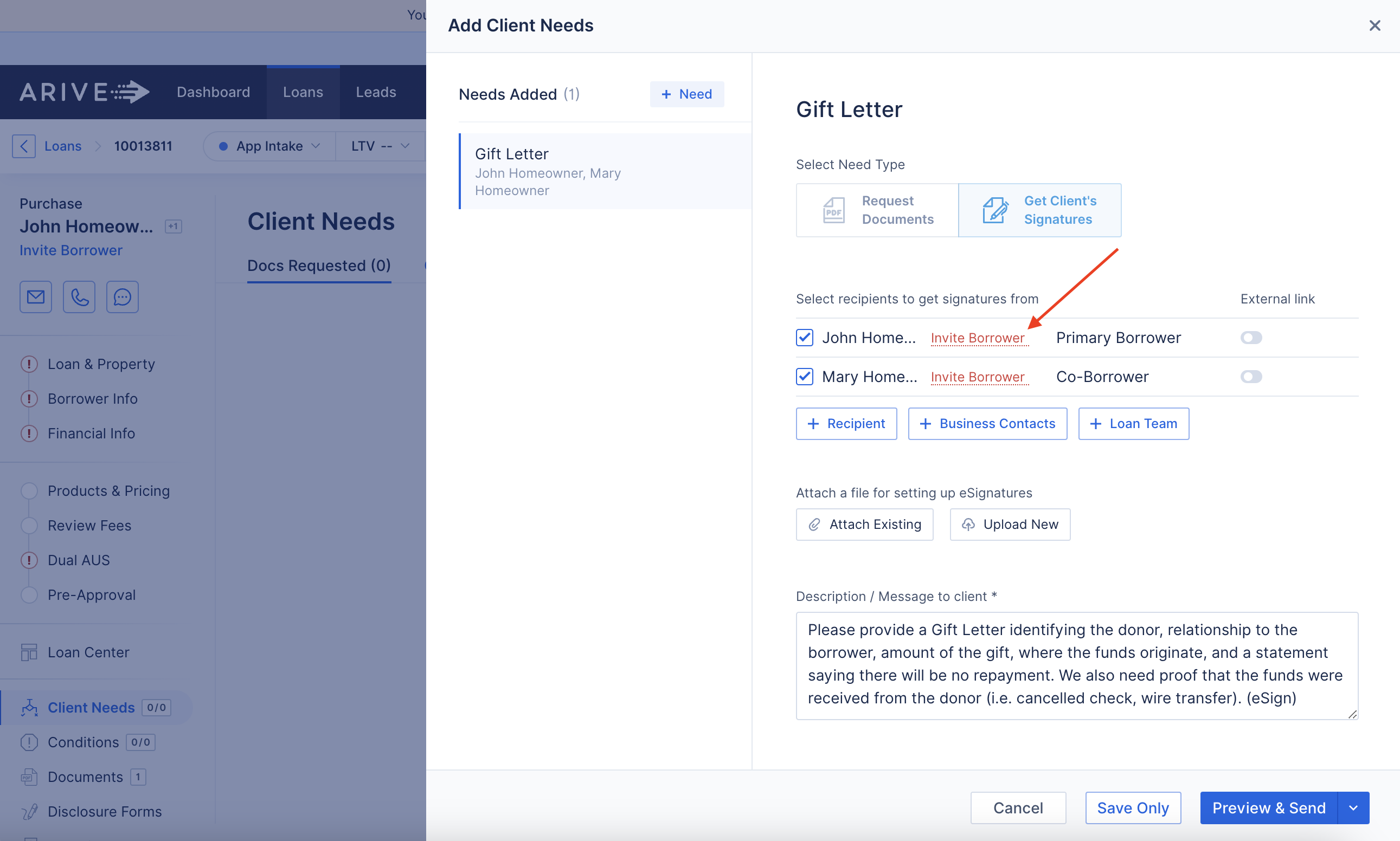 If the borrower(s) haven't been invited to the loan, Invite Borrower will appear in red next to the borrower's name. You can click Invite Borrower and follow the prompts to invite the borrower prior sending the eSign request without navigating from this screen.