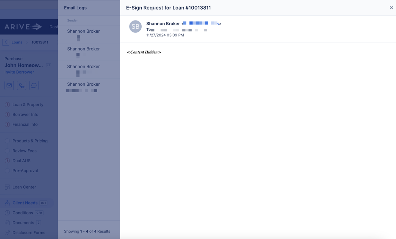If the External Link toggle is turned on, the email located via the loan > ... > Email Logs or profile icon > User Settings > Email Tracking will not show the email contents.