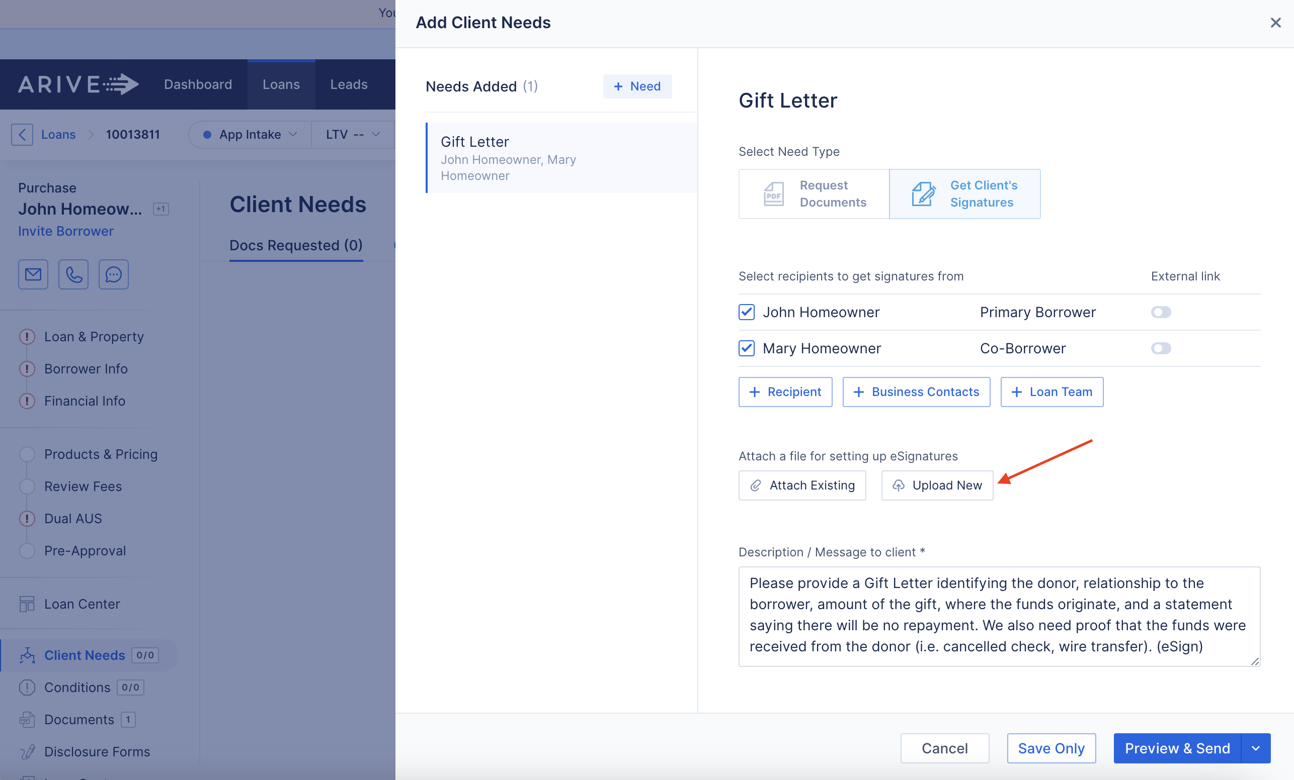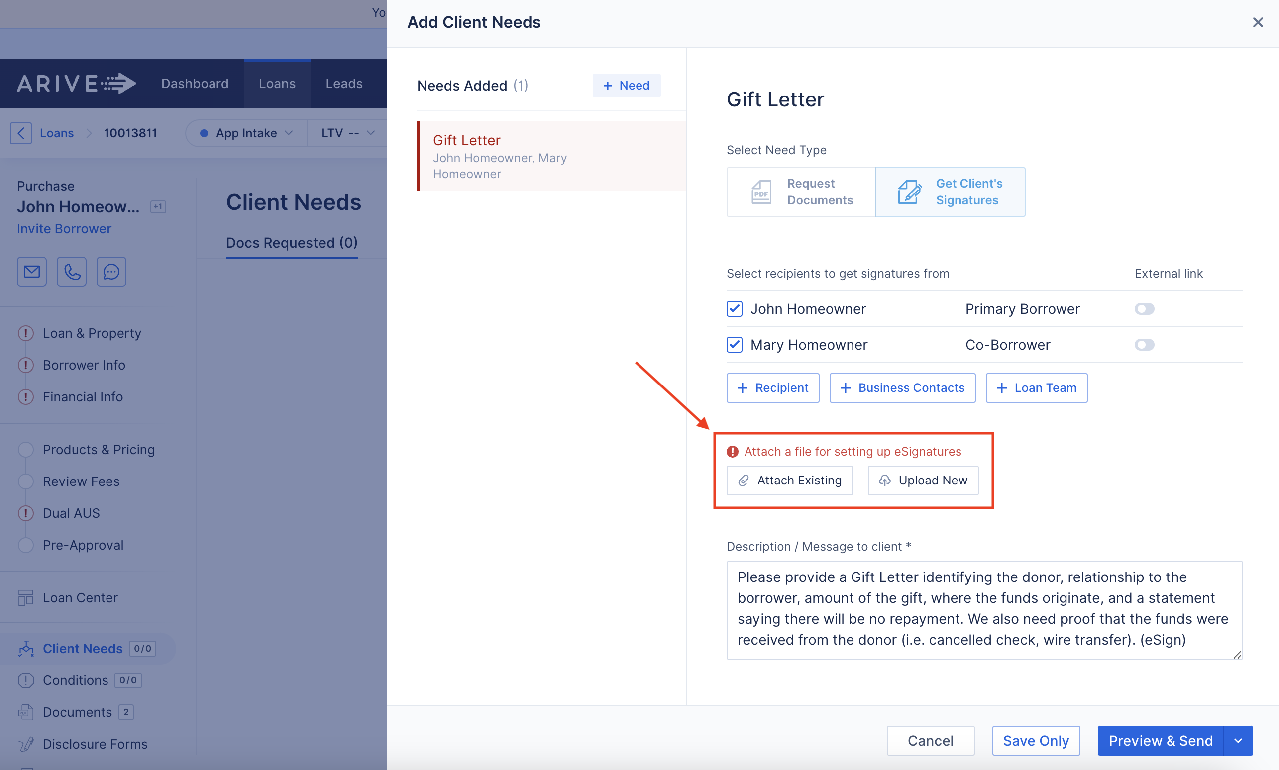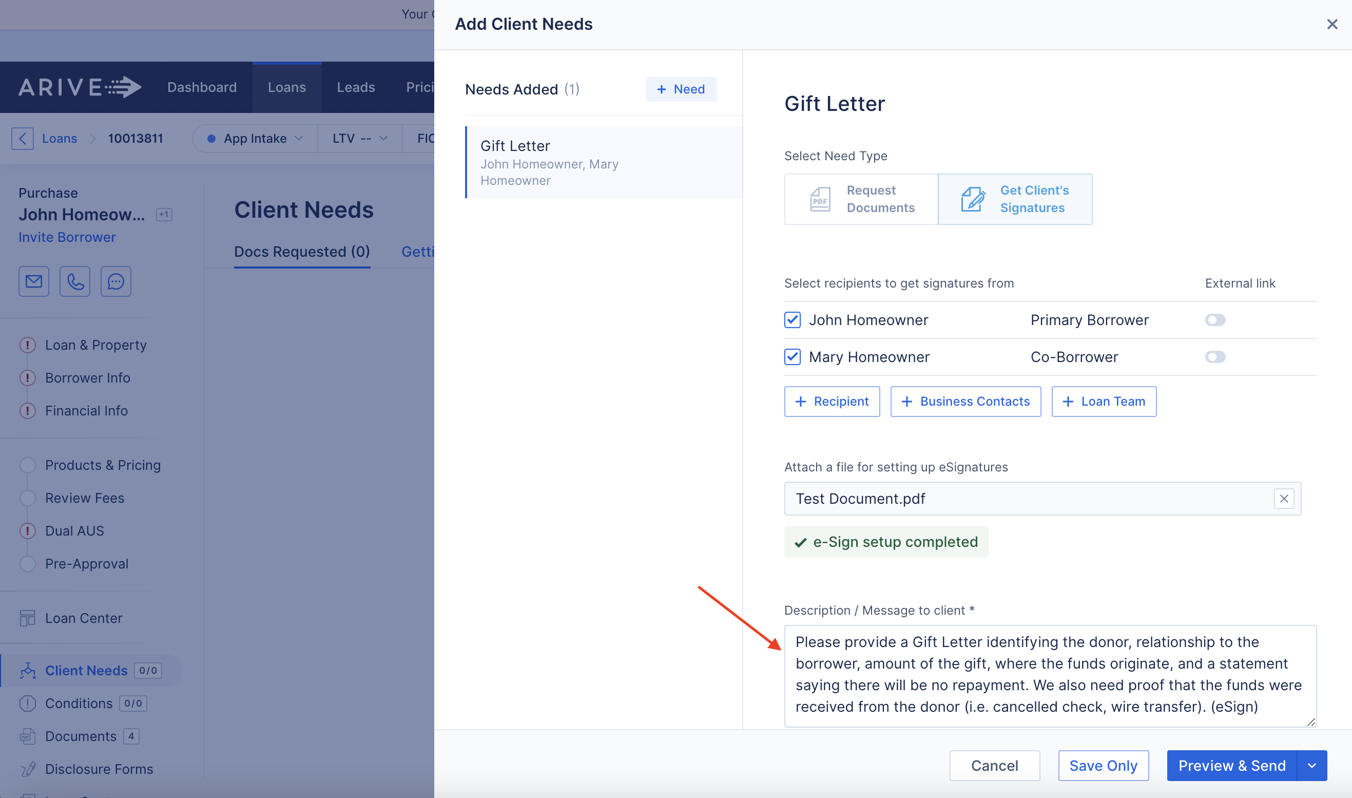 - Save Only will save the eSign request to your Client Needs to be sent out at a later time and/or with other Client Needs.