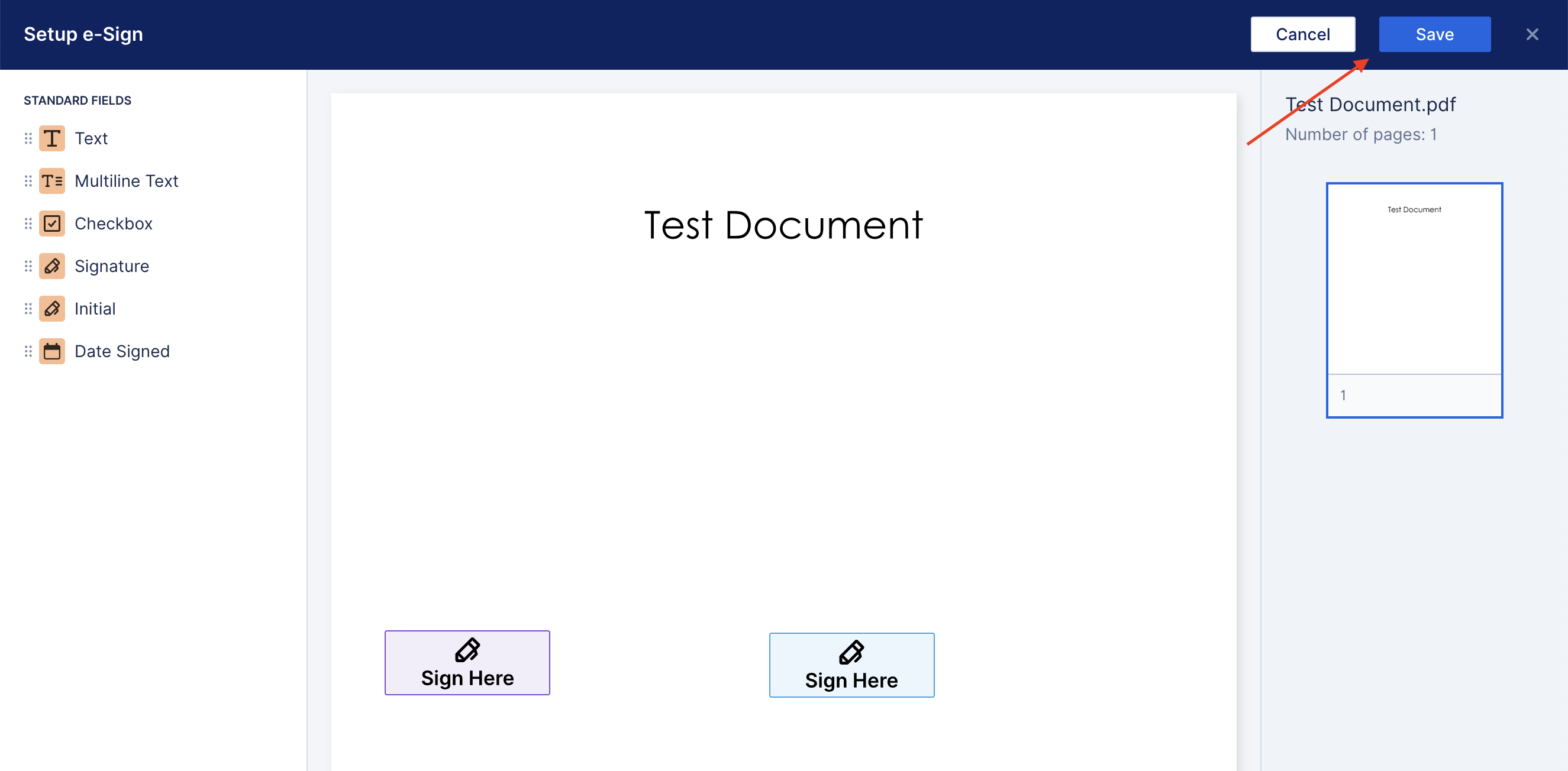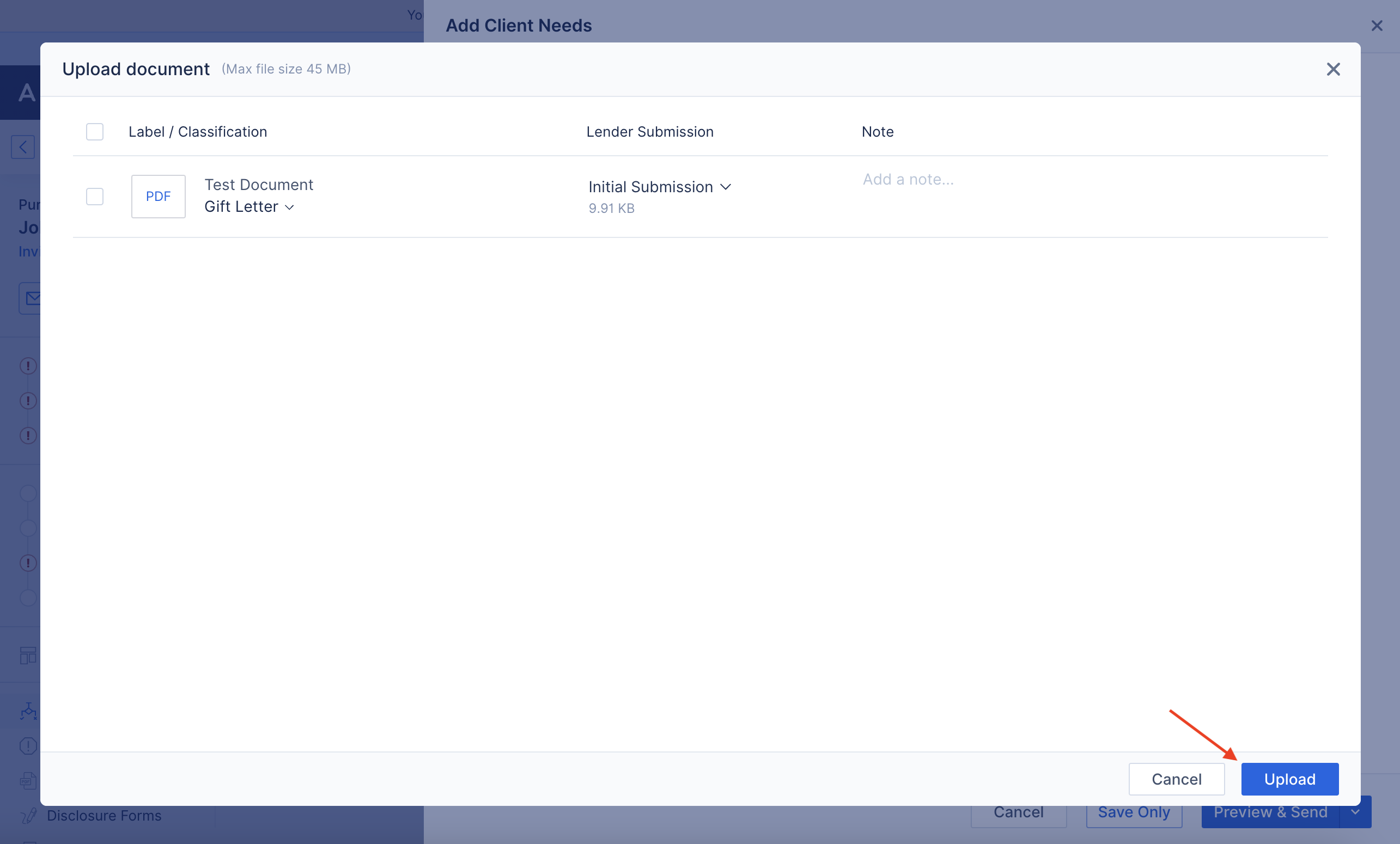 Click Upload in the lower right corner to upload the document to the eSign request.