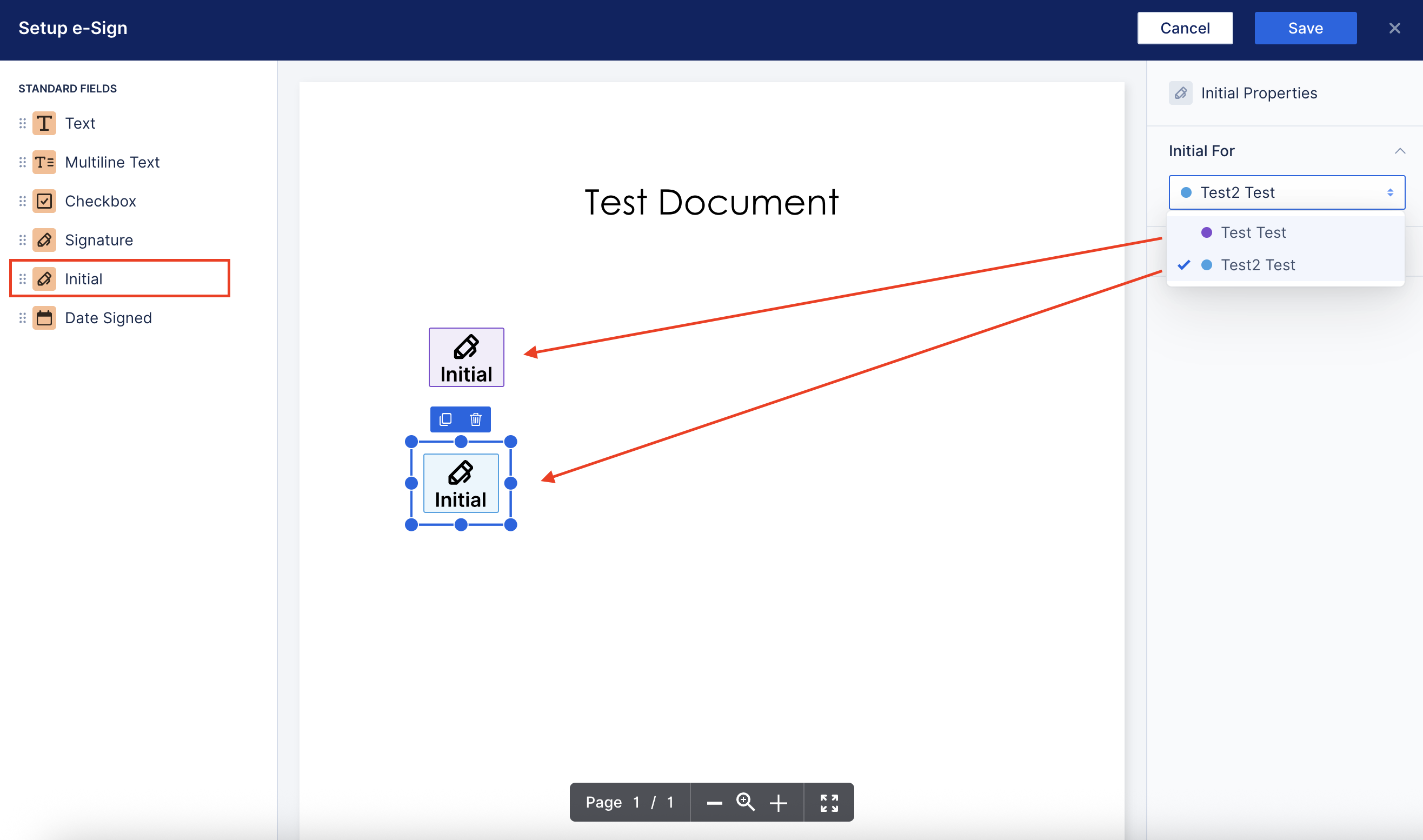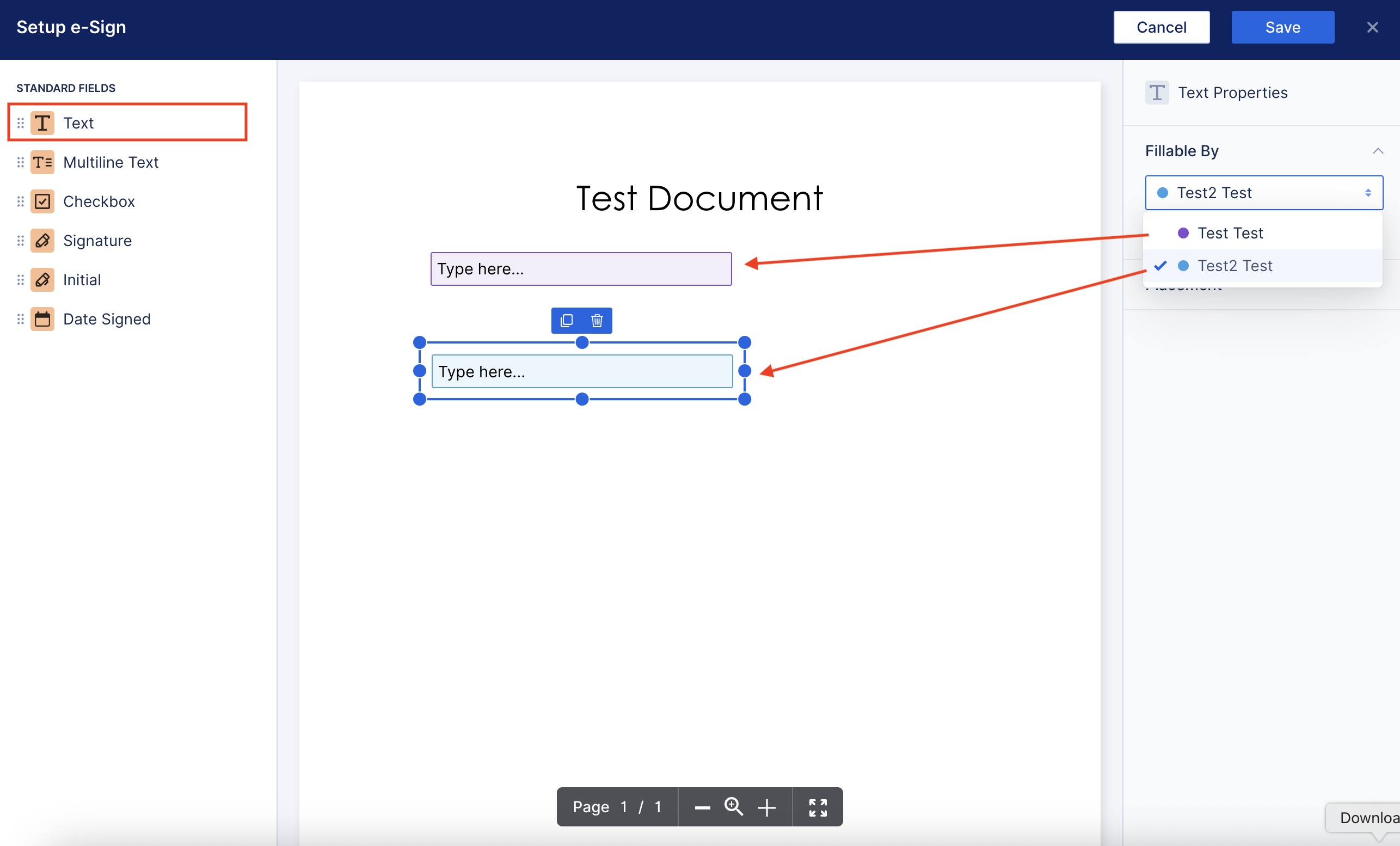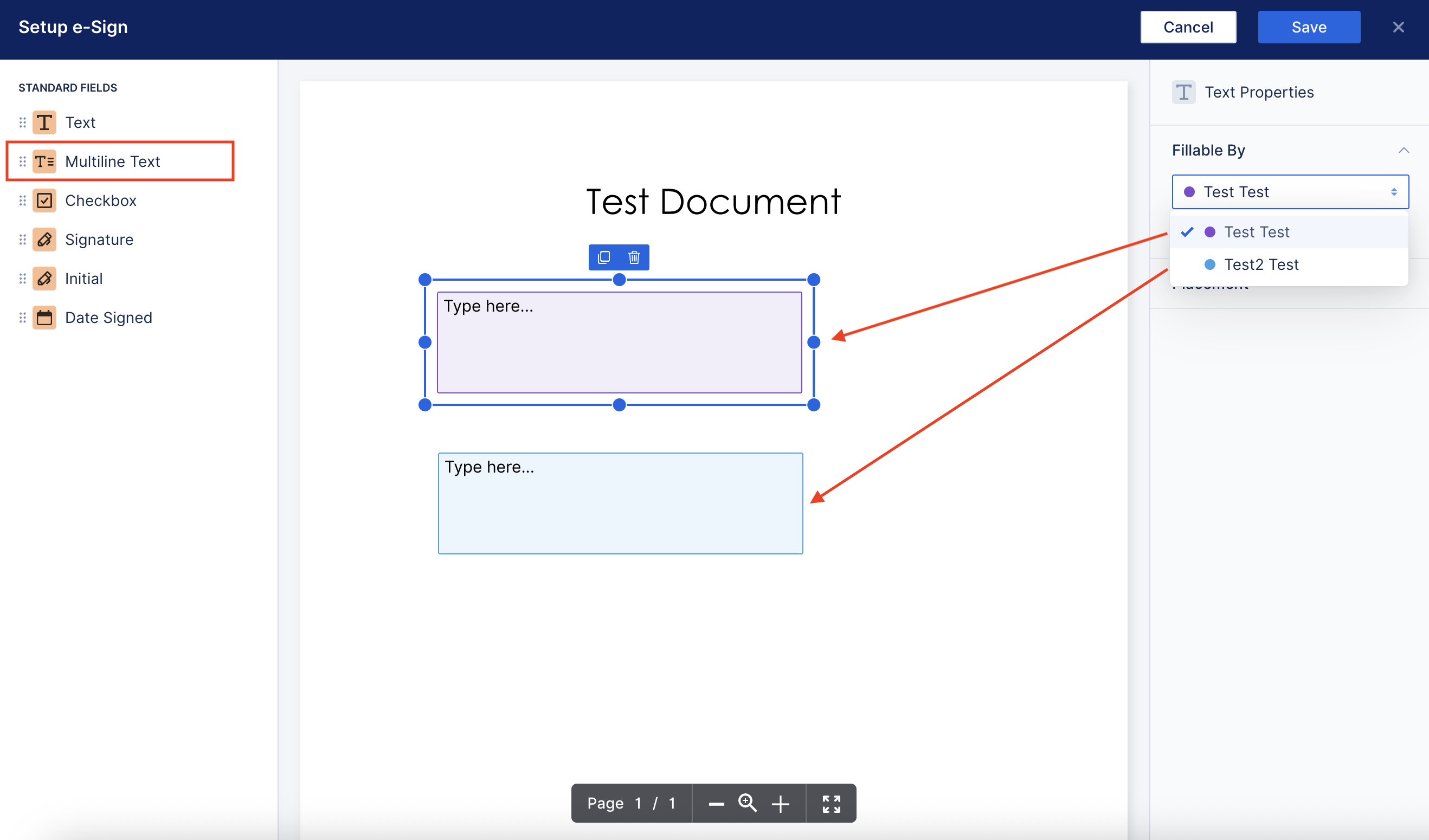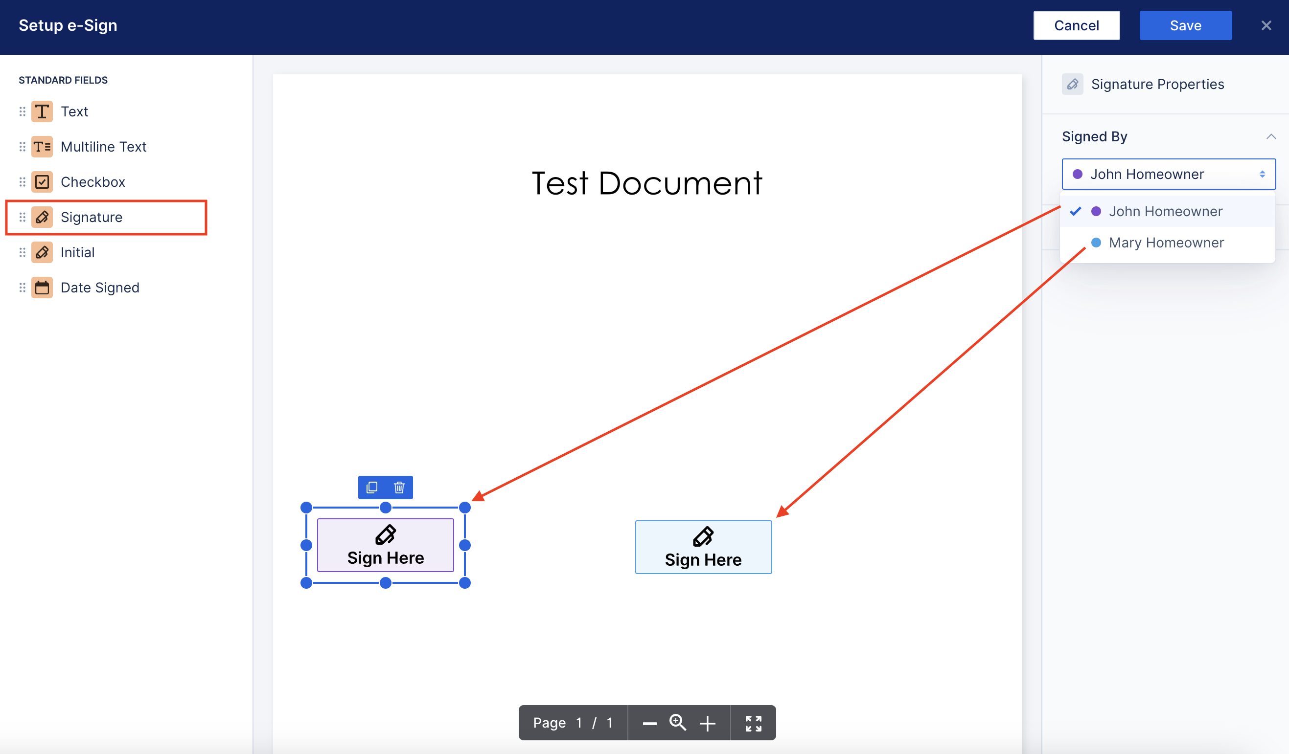 Each signer will be associated with a different color. You can click on the signature field and use the Signed By dropdown to select a different signer.