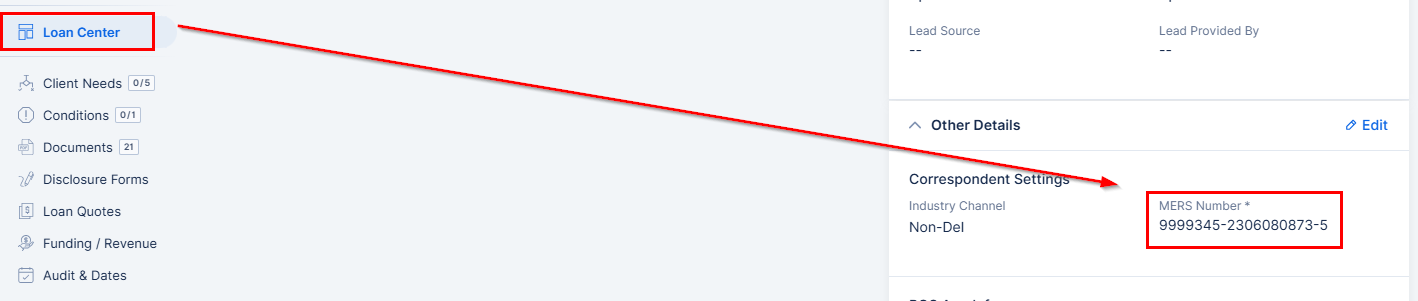 Each Non-Del loan file in ARIVE has a MERS MIN number automatically generated for it, which can be found in the Loan Center tab > Other Details > Correspondent Settings.