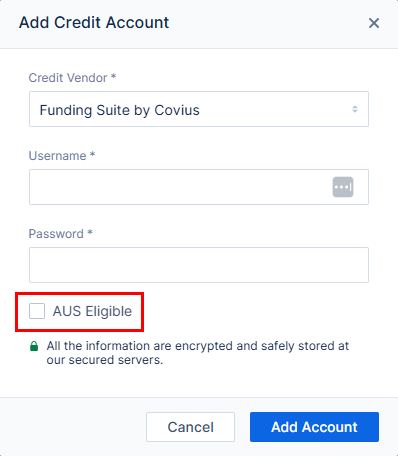 A Funding Suite by Covius account that is marked as AUS Eligible will NOT appear as an option when ordering credit, and will ONLY appear in the credit account dropdown when running AUS.