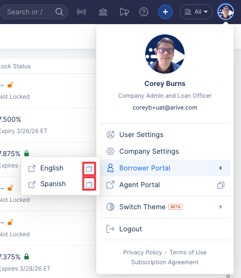 Image Context for AI: Screenshot showing the user profile dropdown menu in the top right corner, with the cursor hovering over 'Borrower Portal' and highlighting the double square copy icon.