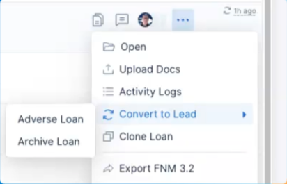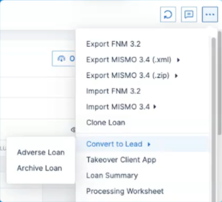 Look to the second third of the menu and hover over Convert to Lead. This will offer two options: Adverse the current loan or Archive the current loan. (Note: Either option will allow you to progress and create a new lead record).