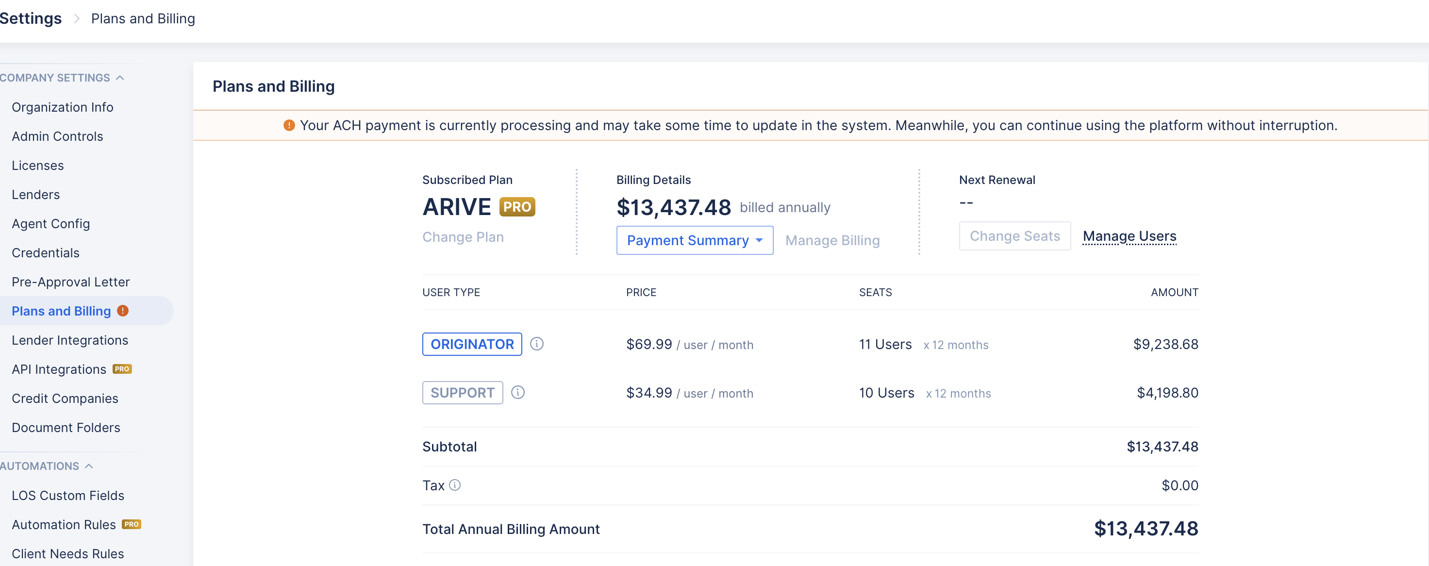 Organizations, Branches, and Users whose ACH payments are currently being processed will now see an "ACH Processing" status — and more importantly, they can continue using the application without any disruption while their payment clears.