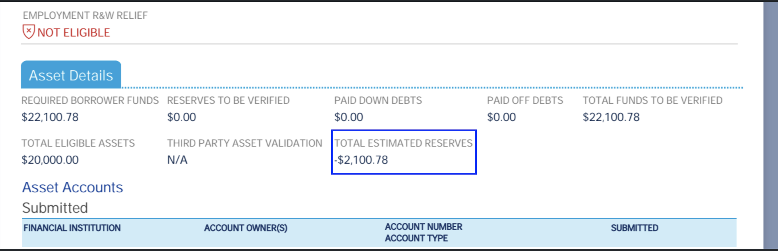 - Total Estimated Reserve Field under Assets — A new field, "Total Estimated Reserve," is now displayed under the Assets section in the LPA Findings Report. This value is calculated directly by LPA and displayed accordingly. Please note that this value is not calculated within ARIVE.