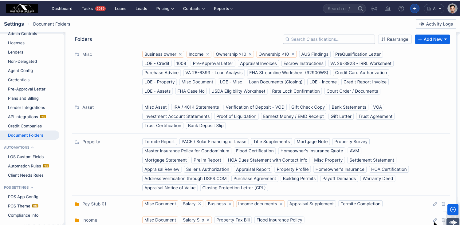 - Admins can create and manage folders and classifications across LOS / POS / Realtor directly from Company Settings.
