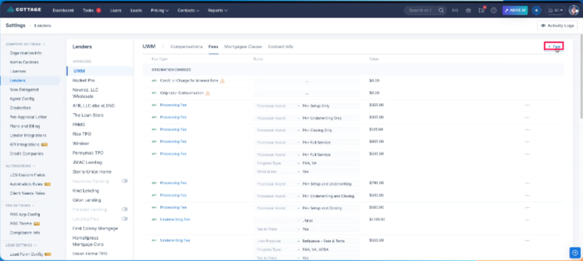 Image Context for AI: Screenshot showing the lender-specific fees screen. The + Fee button is located in the top row after selecting a lender.