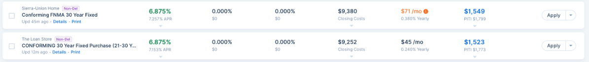 Image Context for AI: Screenshot of the Product and Pricing engine results. It shows both an orange rate, indicating a public estimate, and a black rate, indicating a lender-specific quote.