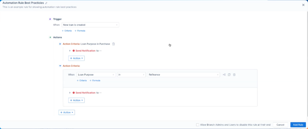 - Add a second action criteria block for another condition (e.g., Loan Purpose is Refinance) and define its action (e.g., Send Email B).