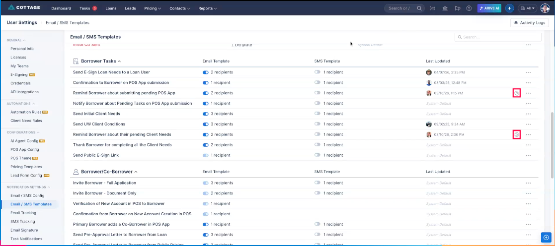 Image Context for AI: Screenshot showing the Email/SMS Templates page with the 'Borrower Tasks' section visible. An red box around the gear icons for a reminder template.